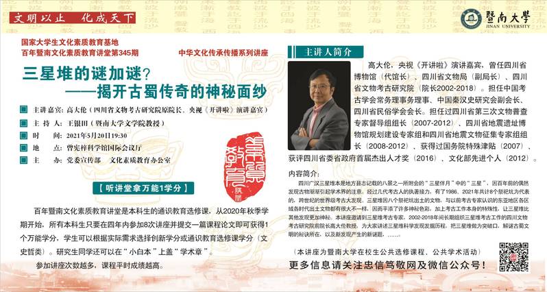 百年暨南文化素質(zhì)教育講堂第345期:三星堆的謎加謎?——揭開古蜀傳奇的神秘面紗