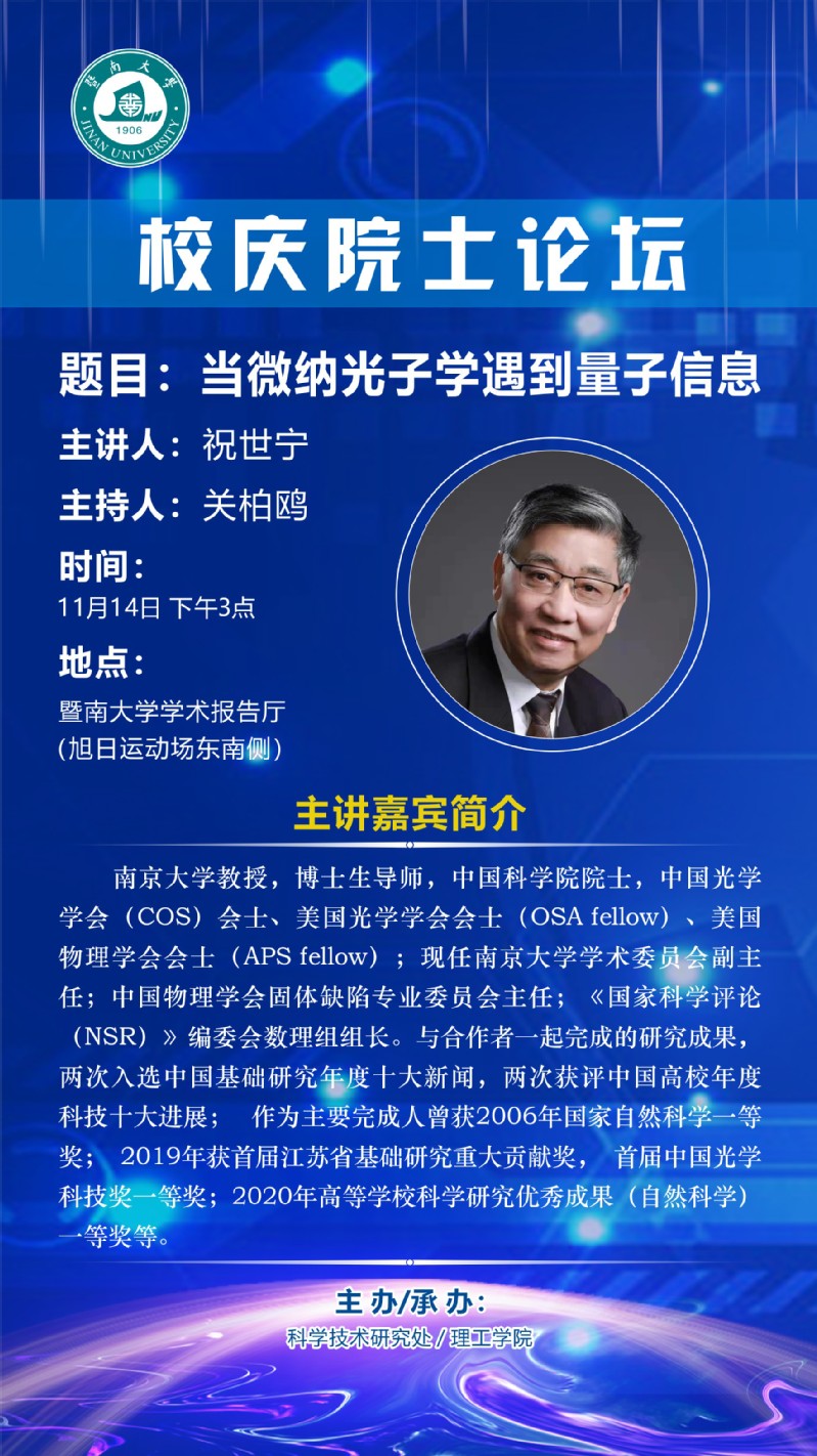 祝世寧,南京大學(xué)教授,博士生導(dǎo)師, 中國科學(xué)院院士,中國光學(xué)學(xué)會(huì)(COS)會(huì)士、美國光學(xué)學(xué)會(huì)會(huì)士(OSA fellow) 、 美國物理學(xué)會(huì)會(huì)士(APS fellow);現(xiàn)任南京大學(xué)學(xué)術(shù)委員會(huì)副主任;中國物理學(xué)會(huì)固體缺陷專業(yè)委員會(huì)主任;《國家科學(xué)評(píng)論(NSR)》編委會(huì)數(shù)理組組長。與合作者一起完成的研究成果,兩次入選中國基礎(chǔ)研究年度十大新聞,兩次獲評(píng)中國高校年度科技十大進(jìn)展;作為主要完成人曾獲2006年國家自然科學(xué)一等獎(jiǎng);2019年獲首屆江蘇省基礎(chǔ)研究重大貢獻(xiàn)獎(jiǎng),首屆中國光學(xué)科技獎(jiǎng)一等獎(jiǎng);2020年高等學(xué)??茖W(xué)研究優(yōu)秀成果(自然科學(xué))一等獎(jiǎng)等。