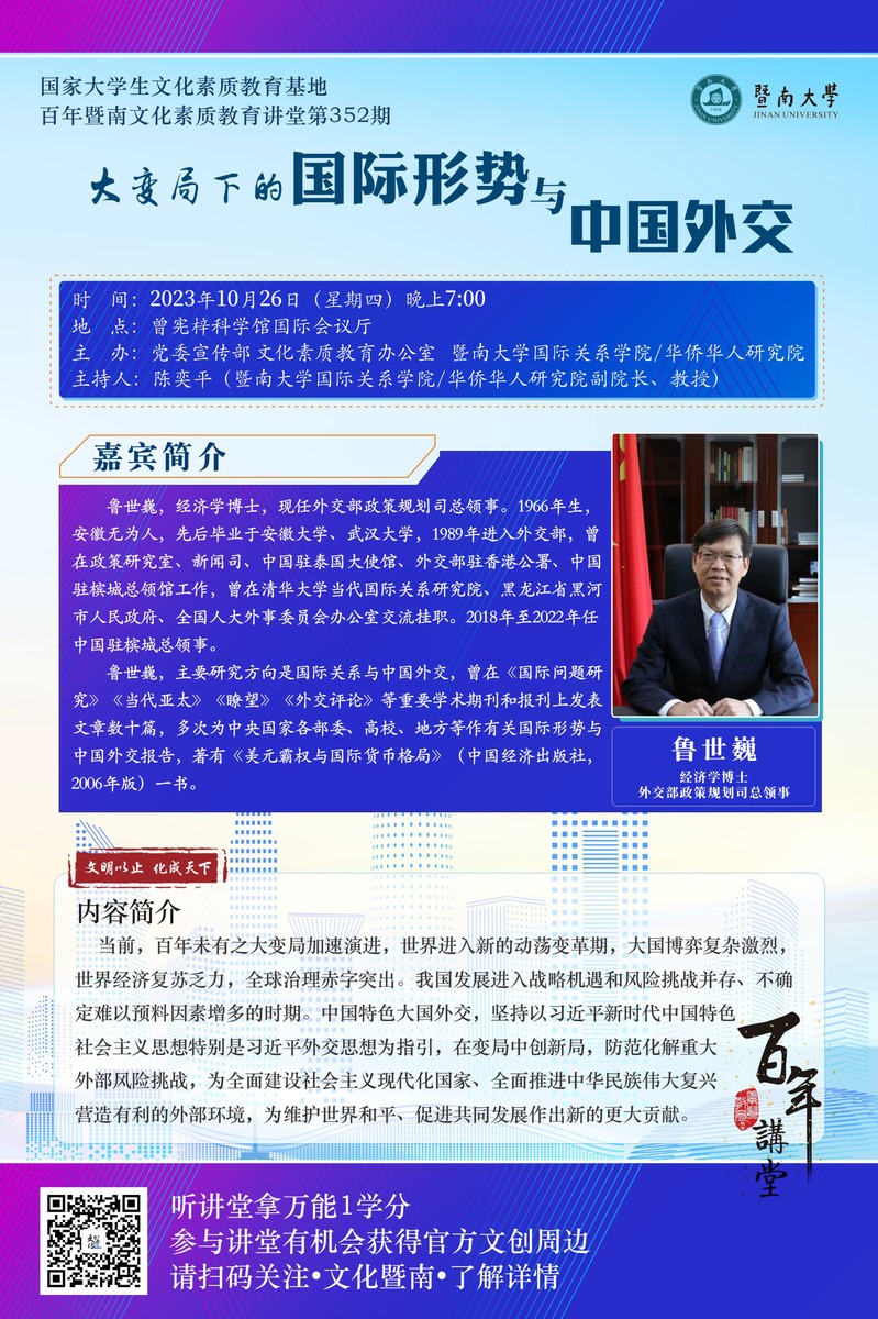 百年暨南文化素質(zhì)教育講堂第352期:魯世?。捍笞兙窒碌膰H形勢(shì)與中國外交