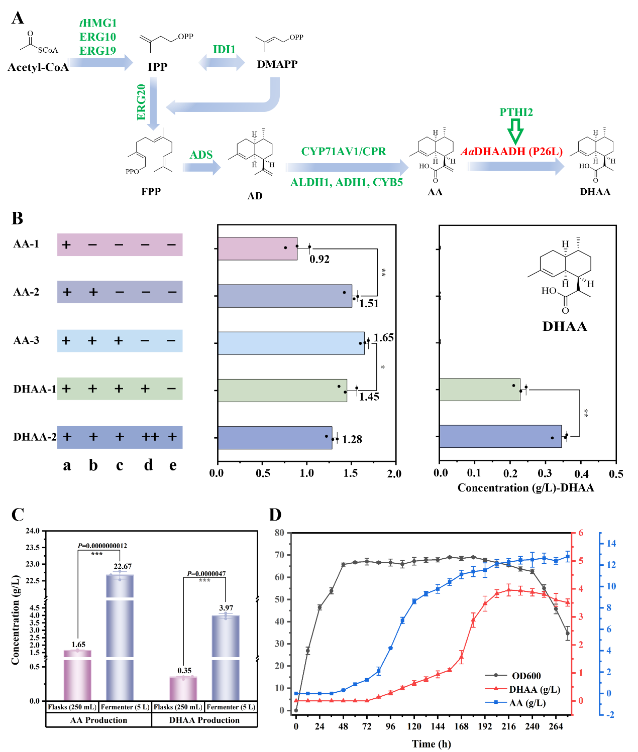 A:ART生物合成途徑關鍵基因的整合;B:搖瓶發(fā)酵中AA與DHAA的產量(a:tHMG1+ERG10+ERG19+IDI1+ERG20+ADS+CYP71AV1;b:CPR+ALDH1;c:CYB5+ADH1;d:AaDHAADH(P26L);e:PTHI2);C:菌株DHAA-2與AA-3的搖瓶發(fā)酵與5 L生物反應器發(fā)酵的產量;D:菌株DHAA-2在5 L生物反應器中的生長及產量。