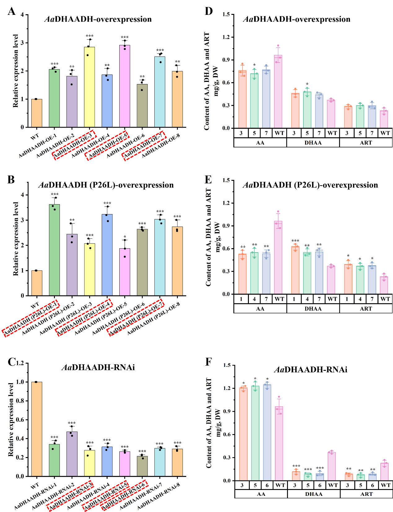 本研究在酶功能驗證中不僅建立異源表達體系(大腸桿菌和本氏煙草),還將候選基因在內源宿主(黃花蒿細胞)中進行功能驗證,該方法更接近酶的天然催化環(huán)境,可以真實反映其生理作用,彌補了異源表達系統(tǒng)的不足。同時,過表達和RNAi干擾實驗的結果相互印證,進一步確證了AaDHAADH在催化AA/DHAA轉化和ART生物合成中的關鍵作用(圖2)。
