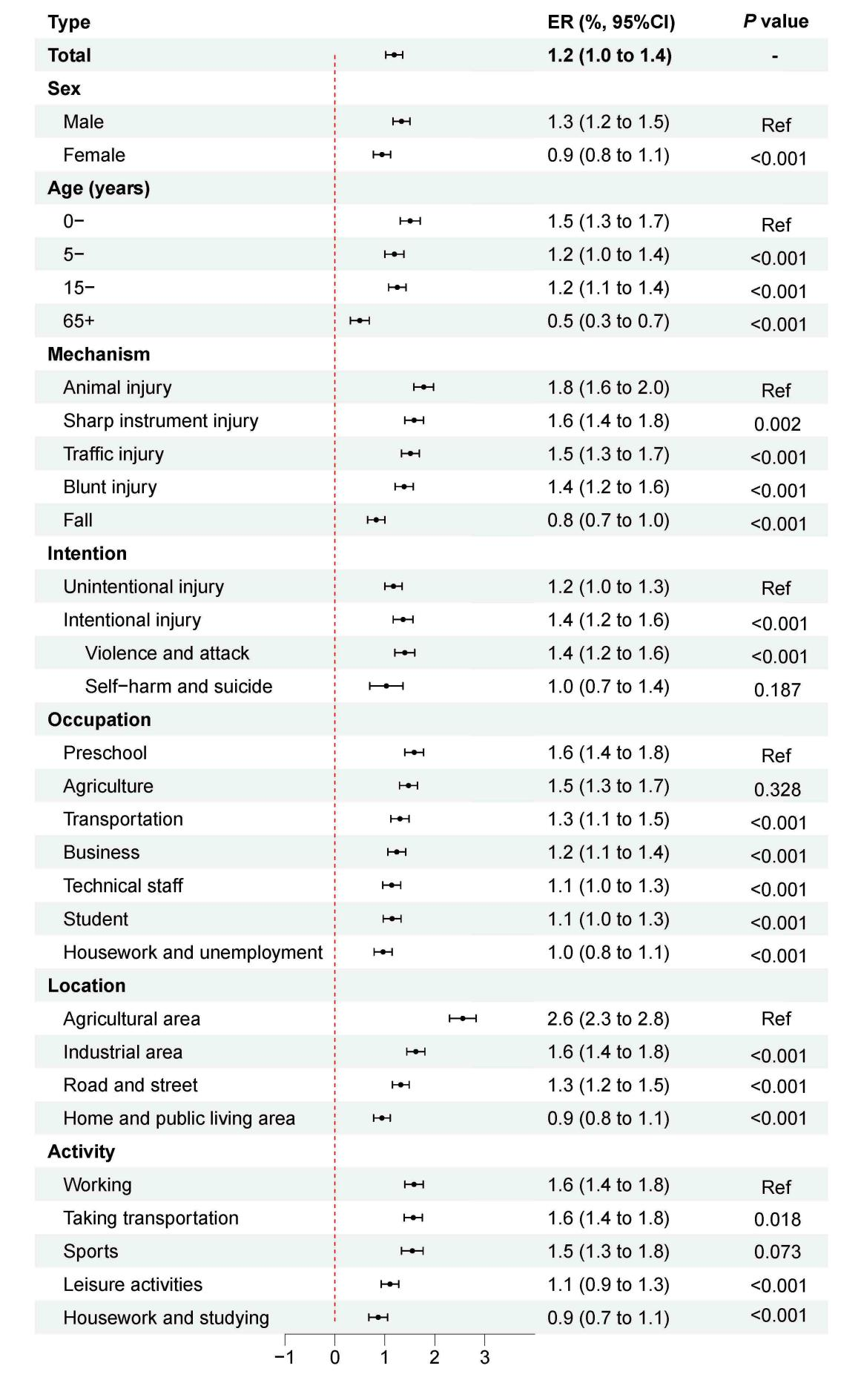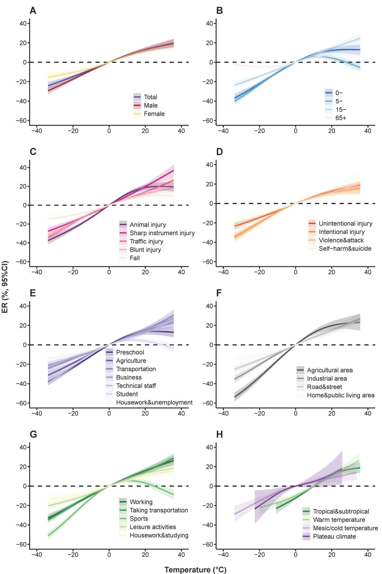 該研究發(fā)現(xiàn),環(huán)境氣溫與人群傷害急診就診呈正相關(guān),日均氣溫每升高1℃,傷害發(fā)生風(fēng)險增加1.2%(95% CI: 1.0%~1.4%)。其中男性(ER=1.3%, 95%CI: 1.2%-1.5%)、0–4歲兒童(ER=1.5%, 95%CI: 1.3%-1.7%)為敏感人群。此外,農(nóng)業(yè)工作場所(ER=2.6%, 95%CI: 2.3%-2.8%)是氣溫相關(guān)傷害的敏感場所;動物傷害(ER=1.8%, 95%CI: 1.6%-2.0%)是氣溫相關(guān)最敏感的傷害類型;海南、陜西、云南、廣東和貴州等熱帶和亞熱帶地區(qū)溫度相關(guān)的傷害發(fā)生風(fēng)險較高,呈現(xiàn)明顯的空間異質(zhì)性。