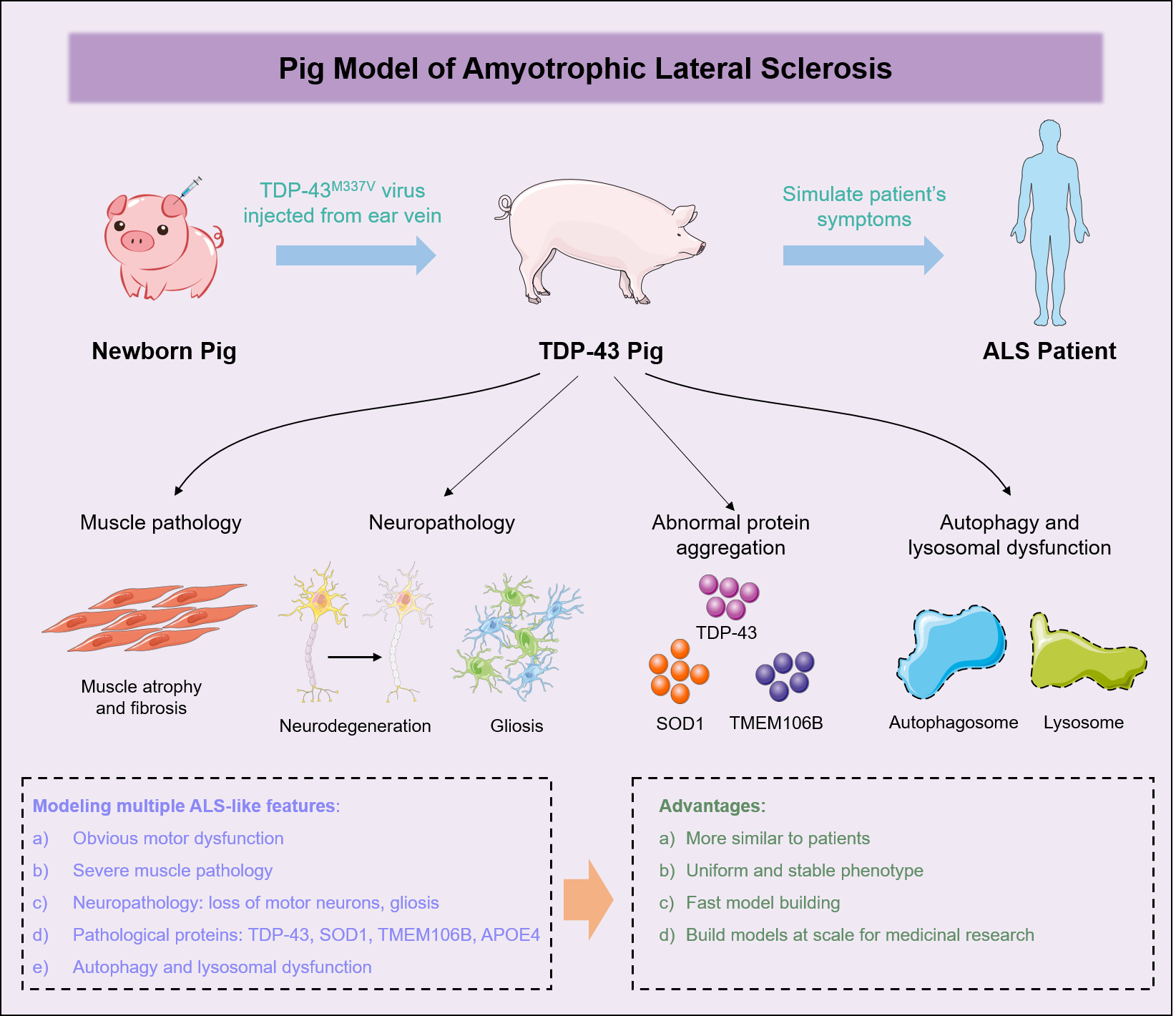 基于上述研究,研究團(tuán)隊(duì)建立了一種快速穩(wěn)定的ALS豬模型方法。該模型成功地模擬了ALS的多種標(biāo)志性病理特征,提供了一個(gè)獨(dú)特的平臺(tái)用以研究ALS中突變TDP-43驅(qū)動(dòng)的致病機(jī)制,以及這些病理事件在ALS進(jìn)展中的相互作用。