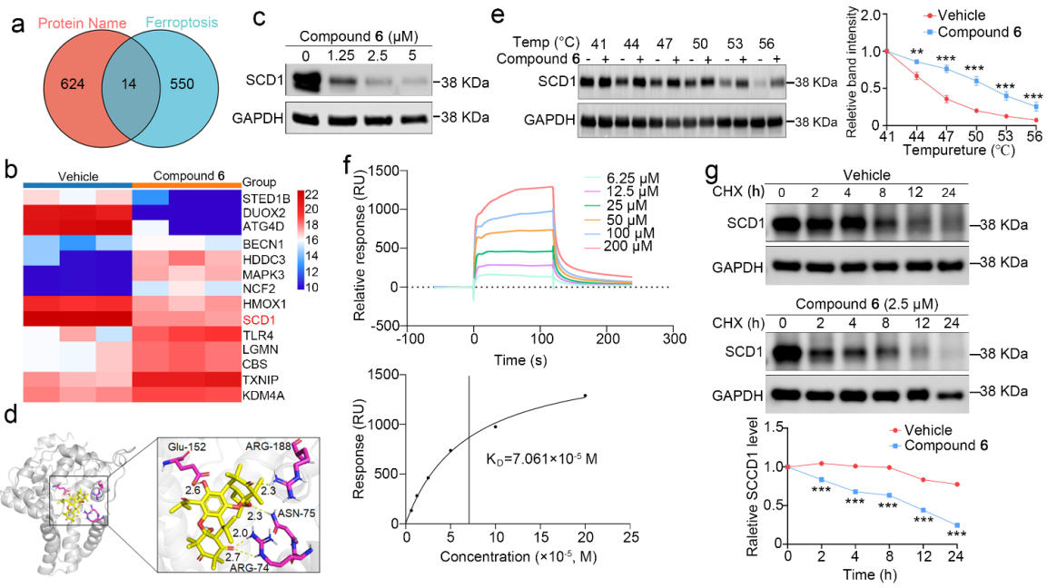 作者對(duì)合成的化合物開展了抗非小細(xì)胞肺癌活性評(píng)價(jià),發(fā)現(xiàn)化合物6在奧希替尼耐藥非小細(xì)胞肺癌異種移植小鼠模型中表現(xiàn)出顯著療效。該化合物主要通過(guò)誘導(dǎo)鐵死亡途徑殺傷腫瘤細(xì)胞。蛋白質(zhì)組學(xué)分析顯示,SCD1蛋白可能為其關(guān)鍵作用靶點(diǎn)(圖2)。隨后,通過(guò)蛋白質(zhì)印跡、細(xì)胞熱轉(zhuǎn)移、表面等離子體共振及蛋白質(zhì)穩(wěn)定性分析等多項(xiàng)實(shí)驗(yàn),證實(shí)化合物6能夠直接結(jié)合并促進(jìn)SCD1降解,從而破壞脂肪酸代謝,誘導(dǎo)脂質(zhì)過(guò)氧化并觸發(fā)鐵死亡過(guò)程。
