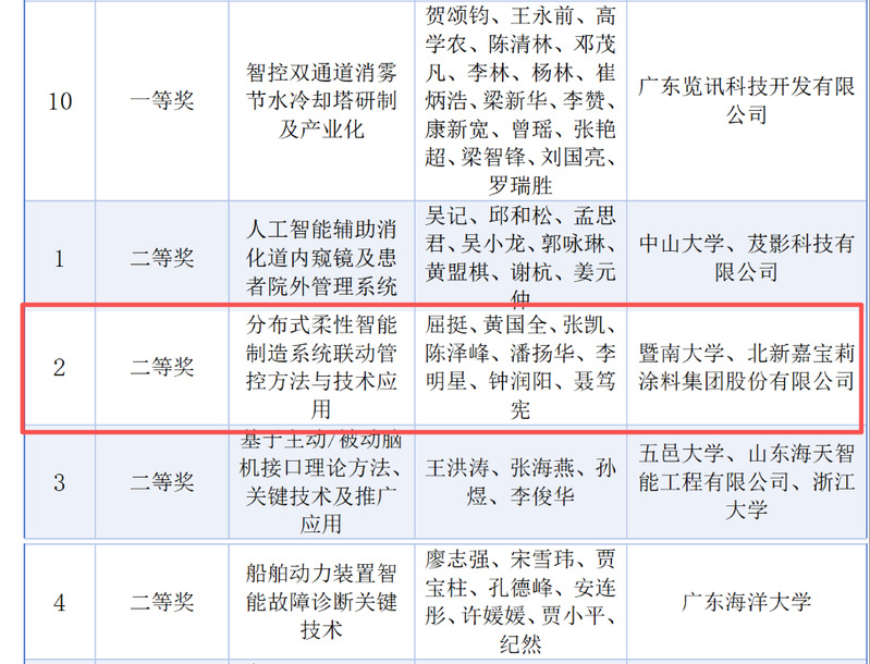暨南大學(xué)融媒體中心訊 近日,廣東省科技成果轉(zhuǎn)化促進(jìn)會公布了2025年度科學(xué)技術(shù)獎獲獎項目名單,由暨南大學(xué)智能科學(xué)與工程學(xué)院/人工智能產(chǎn)業(yè)學(xué)院屈挺教授團(tuán)隊與北新嘉寶莉涂料集團(tuán)股份有限公司聯(lián)合申報的“分布式柔性智能制造系統(tǒng)聯(lián)動管控方法與技術(shù)應(yīng)用”項目獲批科技成果創(chuàng)新獎二等獎。該獎項為校區(qū)首次獲得,標(biāo)志著校區(qū)在產(chǎn)學(xué)研協(xié)同創(chuàng)新與科技成果轉(zhuǎn)化方面取得新的突破。