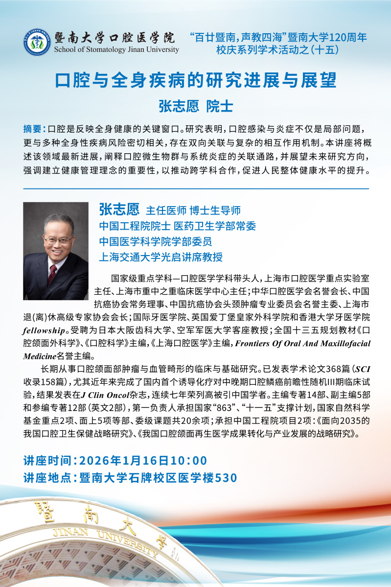 【百廿暨南,聲教四?!啃c系列學術(shù)活動(十五)——中國工程院院士張志愿:口腔與全身疾病的研究進展與展望