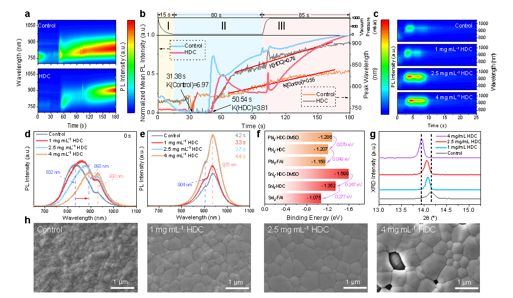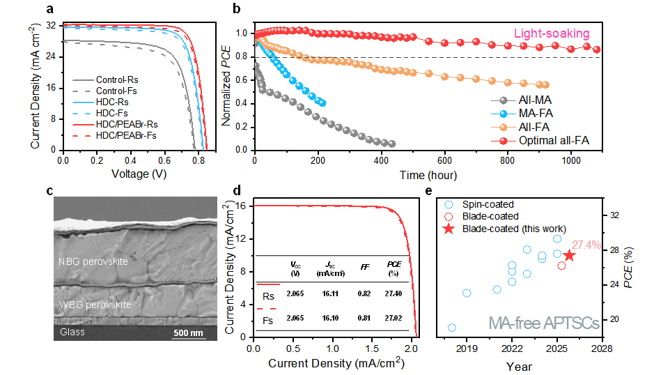 在此基礎(chǔ)上,團(tuán)隊通過在鈣鈦礦前驅(qū)體中添加少量二氯化肼(HDC),使用刮涂工藝制備了高質(zhì)量的甲脒基Pb-Sn鈣鈦礦薄膜。研究表明,HDC與Sn2+離子的選擇性強配位作用不僅抑制了Sn2+的氧化,更重要的是,平衡了Sn基和Pb基物相的成核速率,從而顯著提高了鈣鈦礦薄膜中Pb-Sn合金相的均勻性。所制備的單結(jié)全甲脒基Pb-Sn鈣鈦礦太陽能電池和無MA疊層器件分別實現(xiàn)了21.81%和27.40%的光電轉(zhuǎn)換效率。此外,未封裝的全甲脒基Pb-Sn器件在85℃下經(jīng)受190小時的熱應(yīng)力后,仍能保持初始效率的80%以上。該研究得到國家自然科學(xué)基金(62174069,U21A20102,M-0515,62374053)等項目的資助。